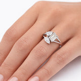 טבעת יוקרתית בעיצוב אלגנטי ומודרני, עשויה זהב לבן ומשובצת יהלומים מרכזים בחיתוך אמרלד, בליווי שני יהלומים בצורת טיפה. השילוב הייחודי יוצר מראה מרשים ועדין כאחד, עם נוכחות זוהרת על היד. טבעת מושלמת לאישה שמחפשת יוקרה.
