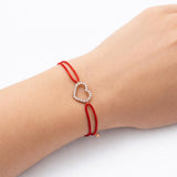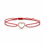 צמיד חוט אדום עם לב בזהב רוז משובץ אבנים נוצצות, משלב עיצוב עדין עם משמעות של אהבה והגנה. צמיד אלגנטי ומתכוונן, מושלם ליום-יום ולמתנה עם ערך וסגנון